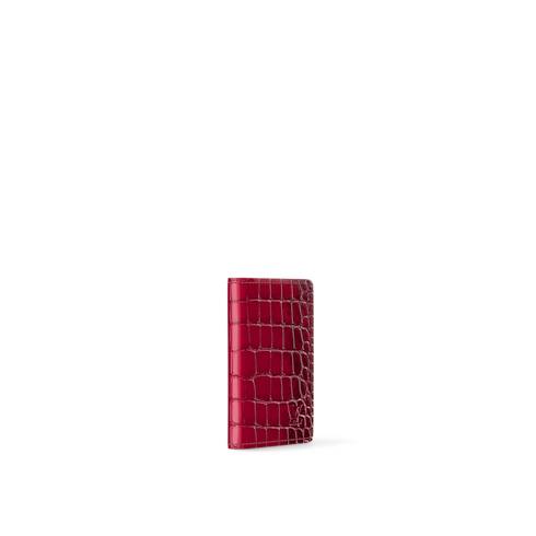 The Pocket Organizer compact wallet is crafted from shiny crocodilian leather in a daring colorway that highlights the natural scale pattern of the exotic leather. Naturally occurring black variations during the dyeing process make each wallet unique. This design features three card slots, five pockets, and an outside flat pocket on the back.