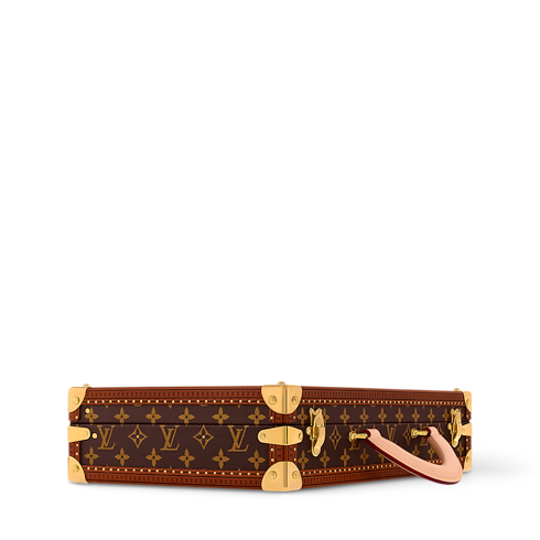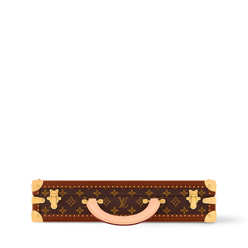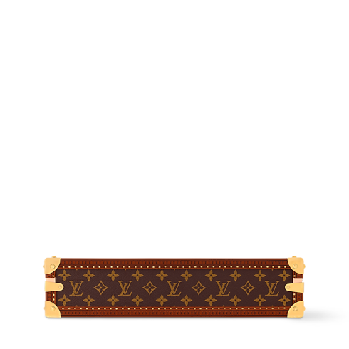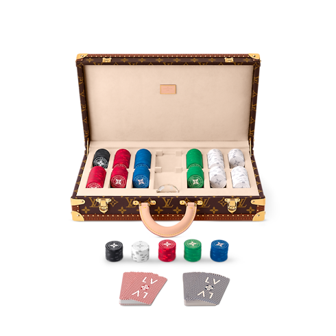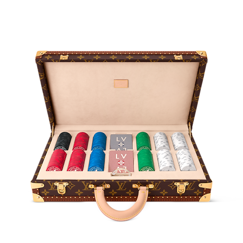 The Poker Box is a trunk-inspired hardcase in Monogram canvas with cowhide-leather trim and golden brass metallic pieces. It is the ideal kit to bring to poker night with friends. It contains everything needed in its luxurious vanilla-colored interior: 300 ceramic chips, two decks of cards, and a dealer crafted from transparent acrylic glass.