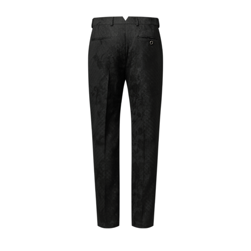 These chic black evening pants are crafted from a luxurious wool jacquard featuring a tone-on-tone Monogram Wildflowers motif with a sumptuous textured finish. Tailored with an elegant Pont Neuf fit, they are signed with an LV-embroidered triangular tab on the right hip and a Marque L.Vuitton Déposée label on the rear waistband. A matching jacket makes a sophisticated suit.