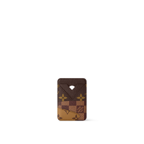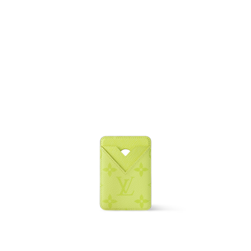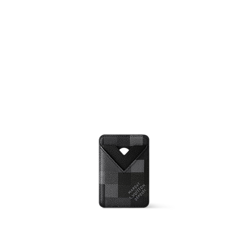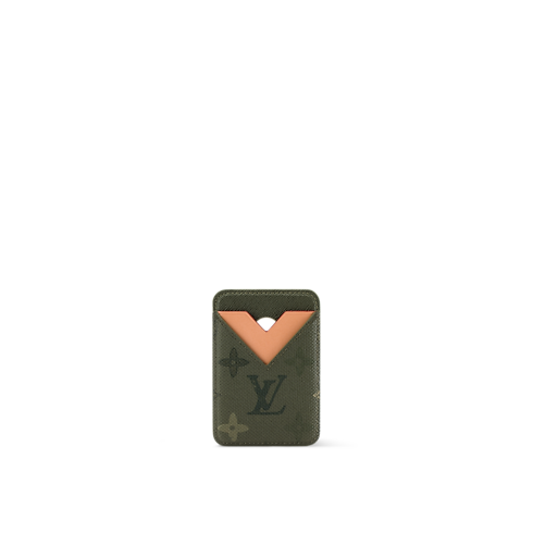 The Porte-Cartes Magnet cardholder is made from gray-and-black Monogram Eclipse coated canvas and brightly colored cowhide leather that emphasizes the V-shaped card slots. The cardholder includes an integrated magnet to quickly attach to any iPhone equipped with MagSafe technology. The card slots can hold most credit and transport cards.