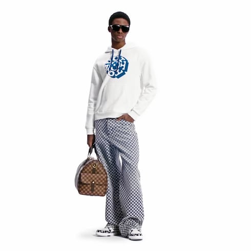 This light, summery hoodie crafted from organic cotton jersey brings a graphic signature accent to everyday looks. The milky white base is embellished on the chest with a contrasting blue Vuitton Flower motif from the Fall-Winter 2025 show. The vibrant color is picked up on the hoodie cordon, which is embellished with aged gold-toned metal tips.