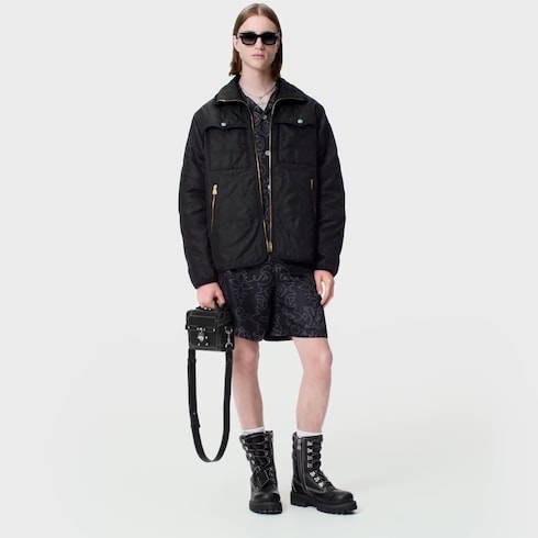 Crafted from pure silk, these printed shorts offer a romantic twist on the Monogram with the FW24 Show’s LV Arabesque motif inspired by ornate cowboy boots. The graphic white-on-black print creates a playful illusion of real stitching. These elegant shorts can be paired with a matching shirt for a relaxed yet chic day-to-evening look.