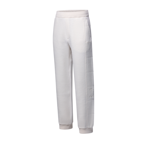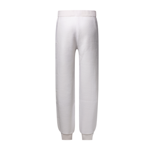Casual yet elegant, these loungewear-inspired pants are perfect for traveling, crafted from warm, softly textured wool fleece in timeless cream tones. Sporty topstitched panels create a quilted effect with an embroidered LV on the left leg. A ribbed waistband and cuffs ensure comfort, while a matching blouson makes a cozy set.