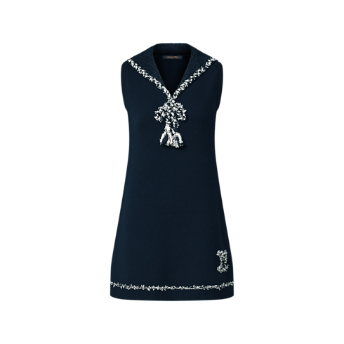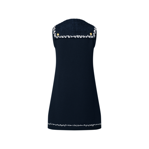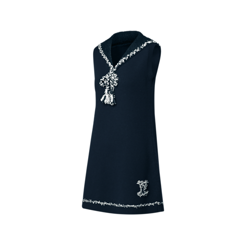 This chic knit dress is crafted in an understated A-line shape from a soft wool-cashmere blend. The neckline is highlighted with a ribbed sailor collar finished with two golden anchor buttons and a tweed-effect trim that knots at the front. A coordinating trim highlights the hem as well as a playful LV Initials patch.