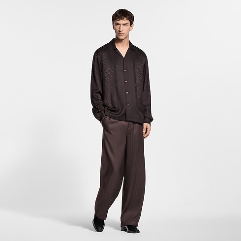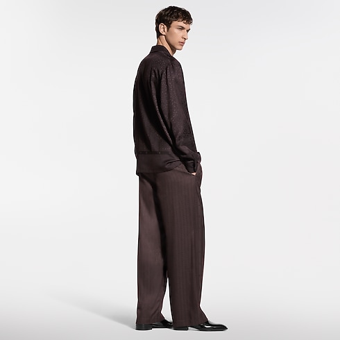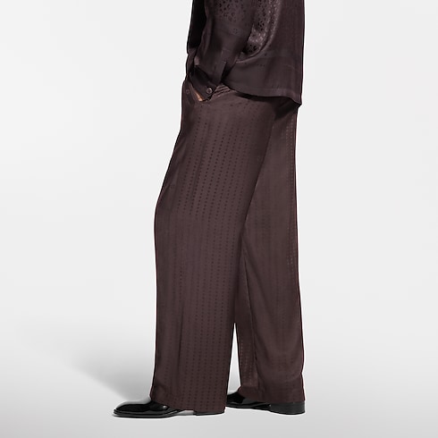 Richly embellished like a scarf, these fluid silk-blend pajama pants in rich brown tones are elevated with a jacquard Monogram Flower stripe motif creating a lustrous play of textures. The flowing, relaxed silhouette has a comfortable elasticated waist signed with a woven LV label. Pair with a matching shirt for a chic and cozy evening set.