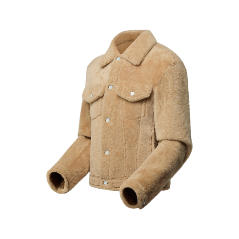 This classic trucker jacket in versatile beige tones is given a luxurious twist in cozy shearling. Embossed Monogram details adorn the soft Napa leather underneath the collar and inside the waist, cuffs and pockets. Pearl-effect buttons engraved with Louis Vuitton signatures and a Marque L.Vuitton Déposée leather label on the back add a chic finishing touch.