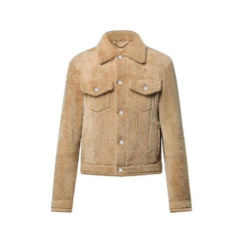 This classic trucker jacket in versatile beige tones is given a luxurious twist in cozy shearling. Embossed Monogram details adorn the soft Napa leather underneath the collar and inside the waist, cuffs and pockets. Pearl-effect buttons engraved with Louis Vuitton signatures and a Marque L.Vuitton Déposée leather label on the back add a chic finishing touch.