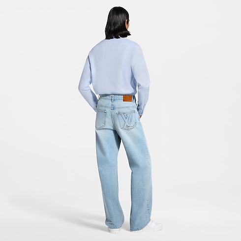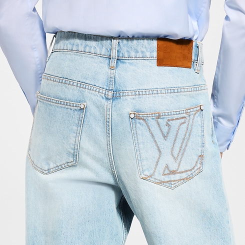 These skate jeans, crafted from premium Japanese denim, are a wardrobe essential enhanced with the Louis Vuitton savoir-faire. With their timeless light blue wash and their casual silhouette, they can be effortlessly styled with any look. Exclusive details include tobacco-toned topstitching, an embroidered LV signature on a rear pocket and signed nubuck patches on the ticket pocket and waist.