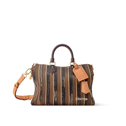 Pharrell Williams introduces brown stripes – a nod to one of the House’s original trunk patterns – on the Speedy P9 Bandoulière 30. Paired with chocolate-hued trim and a cream Monogram lining printed on lambskin, this small bag exudes refined luxury. Signed “L. Vuitton” on the bottom right corner.
