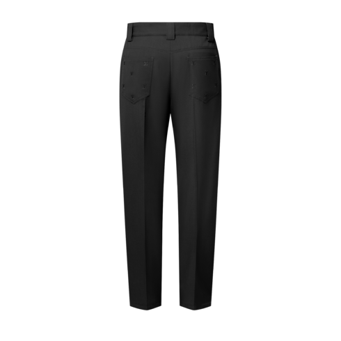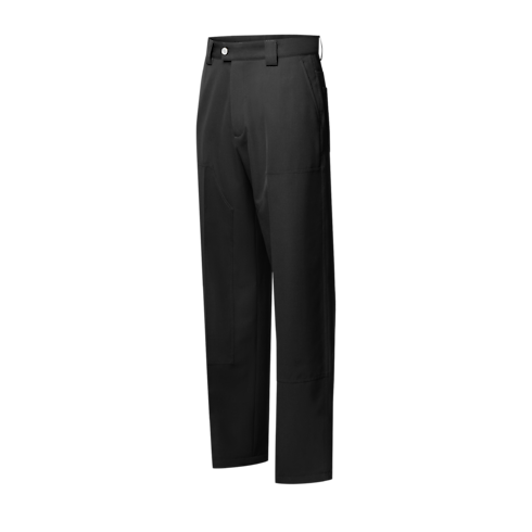 These versatile black carpenter pants complete smart and casual looks with their elegant take on a workwear classic. Their regular silhouette with double knees is crafted from fine wool twill tailoring fabric. LV Blason embroidery in lustrous tone-on-tone yarn elevates the rear pockets, while a pearl-effect button closure adds a chic finishing touch.