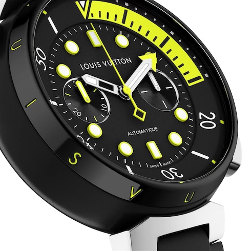 The Tambour Street Diver Chronograph enriches the Street Diver range with an essential complication. The chronograph function underscores the Maison’s pursuit of practicality and readability in the collection, lending these models an even bolder spirit. The Street Diver Neon Black Chronograph features a perfectly-proportioned Tambour case, contrasting finishes and luminescent indexes, for a precision timepiece that will add a sporty, daring allure to any silhouette.