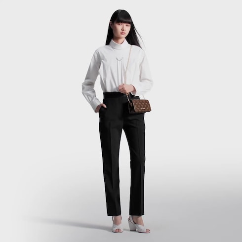 The Lily wallet on chain in Monogram canvas combines a sleek rectangular shape with a subtle retro look. Its flap features a gold-tone plate embellished with rivets and engraved with the Louis Vuitton signature. Large enough to carry essentials from day to evening, it offers different carry options thanks to its removable, adjustable chain with an LV Circle charm.