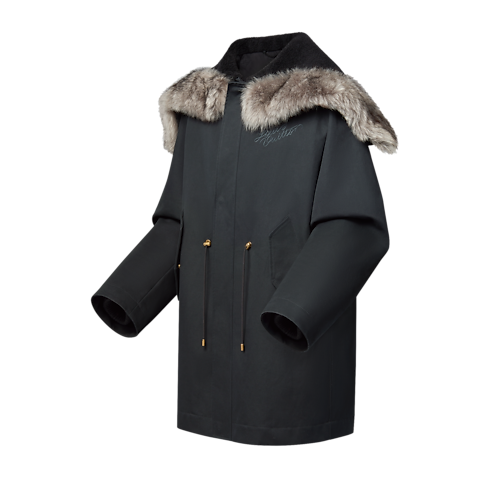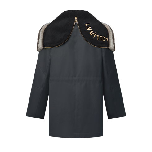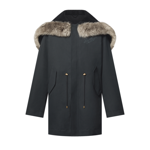 This elegant dark gray parka is a winter essential against the cold, featuring a mid-length cut and Monogram-quilted lining. Timeless at first sight, it stands out with a cozy fur-trimmed hood lined with black fleece, which can be unzipped to create a broad collar showcasing L.Vuitton embroidery. Its flattering silhouette and versatile dark color effortlessly complement any look.