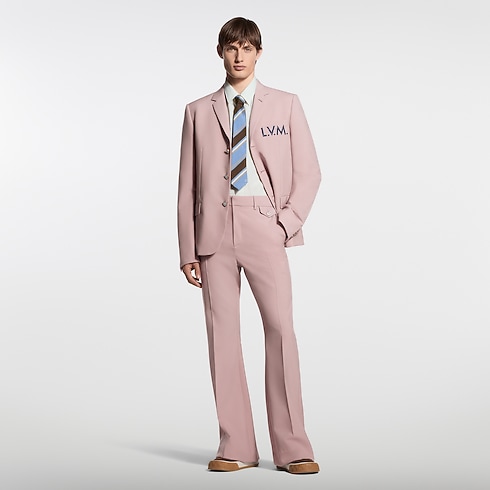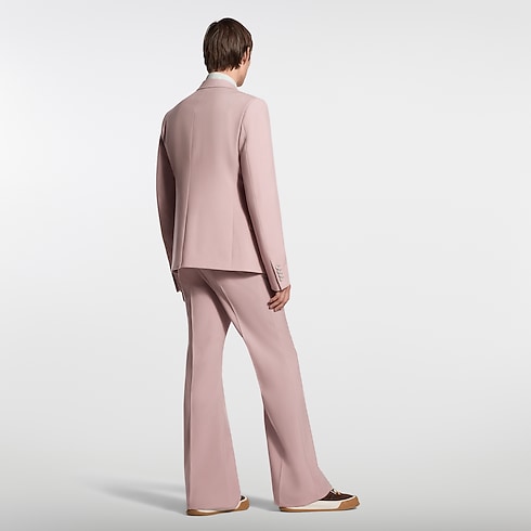 These flared pants from the India-inspired Spring-Summer 2026 show are tailored in fine wool in an elegant dusty pink. Louis Vuitton Paris lettering is discreetly embroidered above a rear pocket, while a buttoned flap pocket accents the hip. Perfect for styling with this season’s nuanced hues, these pants also make a suit with a matching jacket.