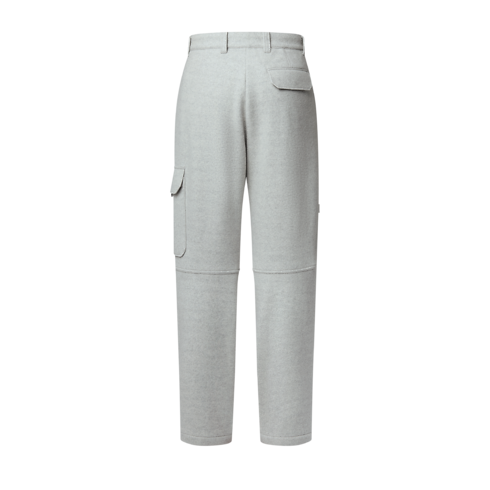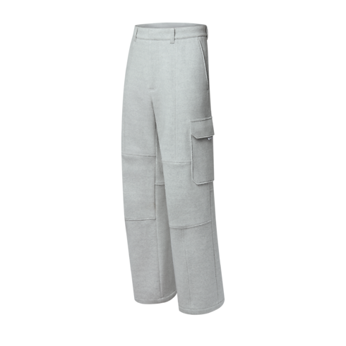 These pale gray cargo pants crafted from certified recycled wool are a comfortable and elegant choice for winter. Their workwear-inspired silhouette is adorned with an LV ornament on the right leg and a woven Monogram Flower label on the flap pocket. This functional and refined design is ideal for traveling paired with a matching overshirt.