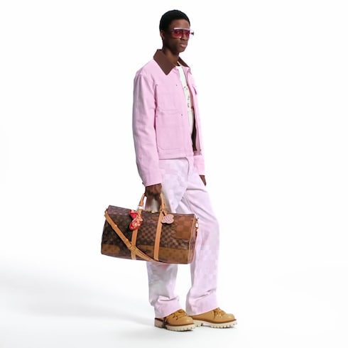 This zippered workwear blouson is from the Fall-Winter 2025 collaboration between Pharrell and Nigo. It stands out with its cherry blossom pink color recalling Nigo’s Japanese heritage, and has a light, quilted lining for transeasonal versatility. Smart accents include a leather Marque L.Vuitton Déposée label on the front, a ribbed corduroy-effect leather collar and chic pearly snap buttons.
